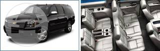 Accommodates up to 6-7 passengers and up to 7 pieces of luggage. The SUV features a flat screen DVD, CD Sound System and limo tinted windows.