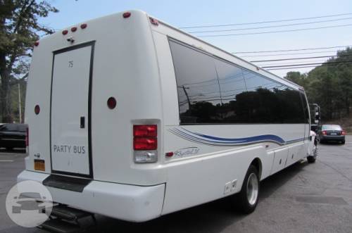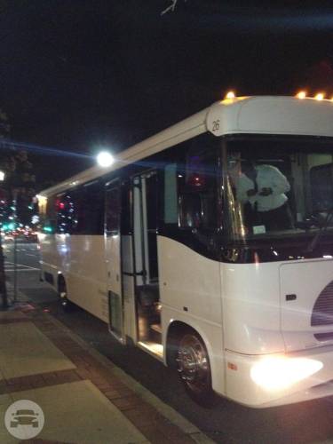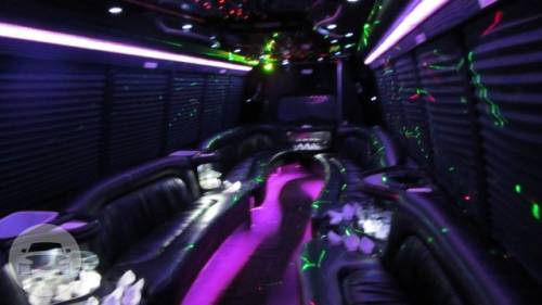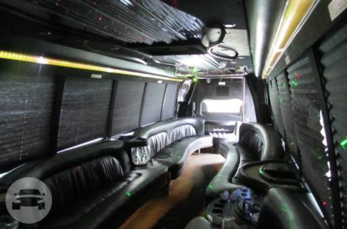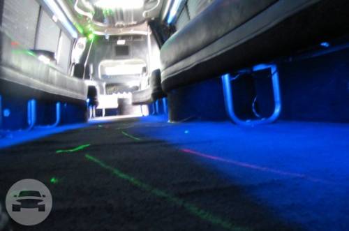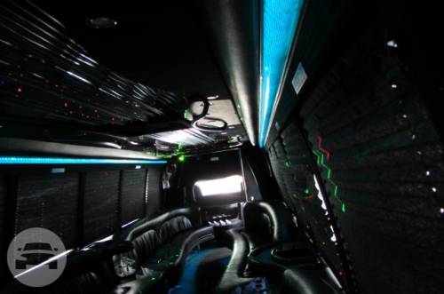 Loaded party bus with surround seating. Perfect for parties up to 24 people to be comfortable with max seating of 27. Excellent for weddings, proms or a trip to the Vineyards. One of the customer favorites. Amenities: RGB Lighting Large flat screen tv Disco Lights Collers all around Star ceiling Restroom DVD iPod Hookup
