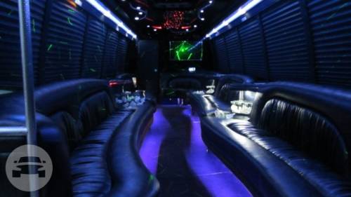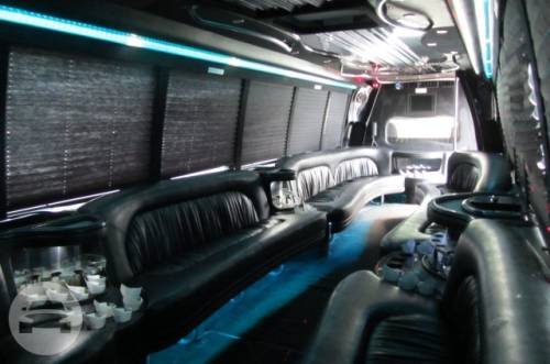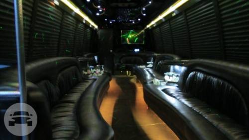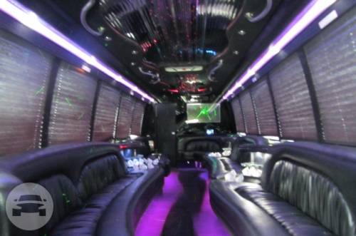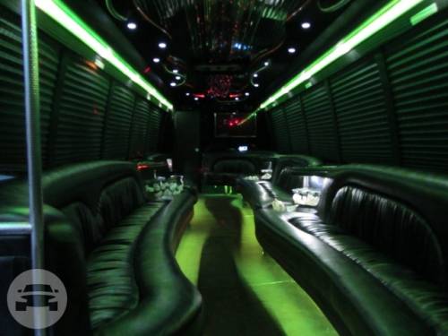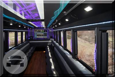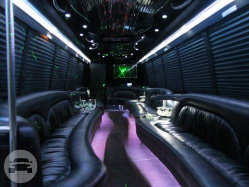 Up to 36 passengers New Limo Bus – 6 to 36 passengers. This vehicle is great for transporting larger groups in style and luxury. It is equipped with a bathroom plush leather sofas and Large Screen TV's,MP3 and Ipod connections . There is ample amounts of luggage space and room for hanging garments in the rear of the coach.