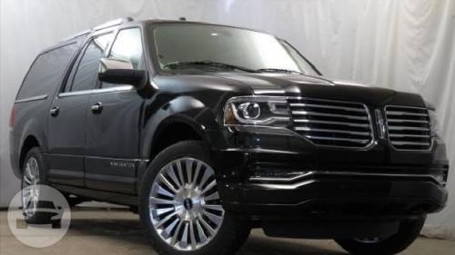 This vehicle is a black Lincoln Navigator SUV with seating and luggage space for 6 passengers. It has black leather captain’s chairs and a rear leather bench.