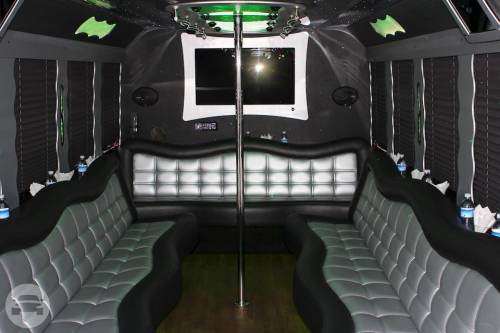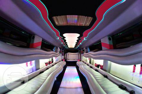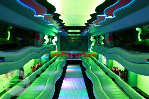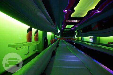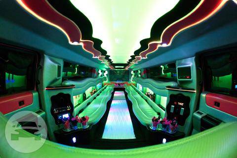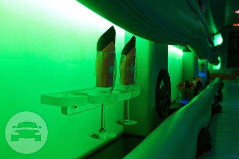 Sleek Single Window Look with 24 LED Coach Lights 18-20 passenger seating Disco Floor and Disco Ceiling 2-tone Ostrich leather interior Full Open back Bar Chrome Wheels 1 Large LCD monitor in divider wall + 2 small LCD in Pillers Premium Sound System, AUX, I-pod hookup Laser Show
