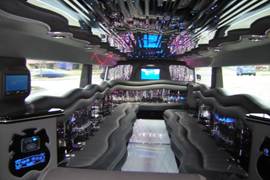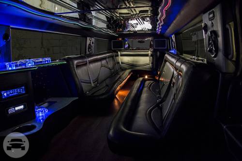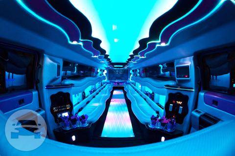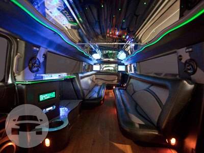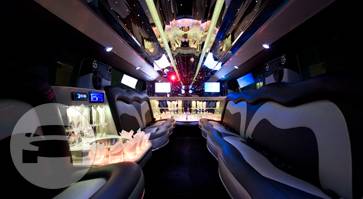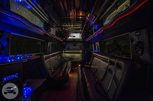 Seats up to 18 passengers based on a 14 inch seat width. This vehicle offers passengers a loud sound system, color changing lights, leather interior, custom exotic hard wood flooring throughout, two televisions, built in coolers, a mirrored ceiling, and tinted windows, leaving you with the ultimate vehicle for the nigh