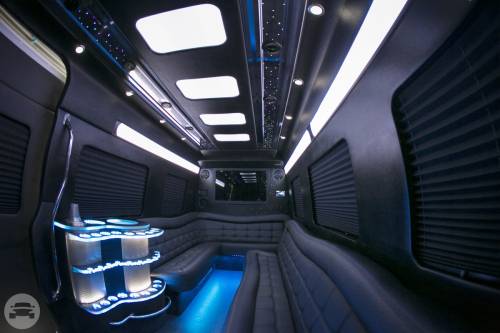 Get this Luxury Limo Bus While You Can The Mercedes Coach 2 is truly a beautiful new addition to our growing fleet of party buses and limos! The mood lighting and star gazer lights are state of the art! This vehicle features one large bar section and two huge flat screen TV’s, making it a simple matter to offer guests the best in entertainment. Black ostrich leather seating and privacy blinds finish off the interior of this 14 Mercedes-Benz bus, creating a truly luxurious and stylish means of travel. Features 14 passenger 2 Plasma TV's 1 Large Bar Area LED Lights & Rockford Fosgate Sound