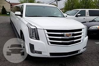 This white Cadillac Escalade holds 12-14 people and features: TV with DVD Player Radio with Aux Cord Bar