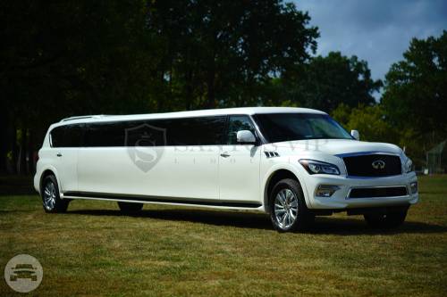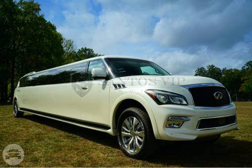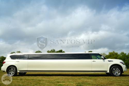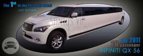 18 Passenger Capacity 20″ Wheels Privacy Partition Multiple LCD Screens Custom Kenwood Sound System iPod/Andriod/USB connectivity Complimentary Soft Drinks Two tone leather seating Sleek single window design Multi Color Disco Ceiling Interior Strobe lighting & Multi-point Laser Dual Bars with LED Lighting Dual Laser Machines Color Changing LED Lighting Crystal Stemware & Rock glasses Touch Screen Controls We are proud to introduce our newest addition to our impressive fleet of NJ Limousines, our brand new Infiniti QX-80 stretch limo. This gorgeous limousine has all the amenities of a NYC VIP lounge. If you need to attend a NJ or NYC Prom night, a NYC Bachelor party, New Jersey Bachelorette party, or simply just having a night out on the town and you need to do it in style then look no further. Once again we have spared no expense in making this one of a kind custom limousine fully loaded with all the amenities you have come to expect from a Santos VIP Limo in NJ. We started with one of the hottest trucks on the market and designed with our coach builder a one of a kind interior. On the exterior we went with our signature sleek single window design and Intelligent LED opera lights. In keeping with our NYC Club style motif we adorned the interior in exquisite imported leather and introduced a new material which replicates a carbon fiber look. As with all our recent builds we have also installed a fiber optic intelligent lighting system in the ceiling and a hardwood charcoal colored floor. The dual bars have tiered white marbled bar tops with stainless steel ice chests, crystal champagne flutes and glassware as well as color changing mood lighting built into the bar. To finish this specatcular interior, we installed a custom Kenwood sound and video system that is simply incredible. With a ride like this we are sure you and your guest will get the party started long before you have reached your destination! Call us today to reserve this one of kind limousine!
