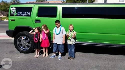 Up to 20 Passengers Leather Interior's Flat Screen TV's Fiber Optic, Neon, Laser & Strobe Lighting DVD & CD Player with Satellite Radio Wet Bar, Privacy Partition, & Passenger Controls When your special occasion calls for luxury transportation and a traditional limousine just won’t do, you need to check out 24/7 Limousine’s 1-20 passenger green stretch Hummer. If high profile transportation is what you want, it doesn’t get any better than this gorgeous green stretch Hummer with all the bells and whistles. Passengers of all ages will get a kick out of rolling down the road in this bad boy. If you are planning your best buddy’s final fling as a single man, you will be an instant hero when our stretch Hummer arrives to transport your group to a strip club, nightclub, gun range, adult pool or whatever venue you choose for your party. Activate the fiber optic and neon lighting system, crank up the tunes on the satellite radio and serve up some cocktails from the wet bar to get the party started right away. Your son will be the envy of all his friends when you book our green stretch Hummer for the ultimate birthday party transportation. Whether your destination is a local park, a pizza joint, the go-kart track or miniature golfing, our professional drivers take all the hassle out of driving a group of high-spirited children to a party while saving the wear and tear on your personal vehicle. Close the privacy partition to allow your driver to concentrate on the road, and just go ahead and let the kids be kids as they experience the ride of their lives. This rugged but elegant vehicle turns heads everywhere it goes with its bright green exterior and rims to match. Tinted windows offer passenger privacy while still allowing for spectacular views of the city and the ultimate way to people watch while driving down the Las Vegas Strip.