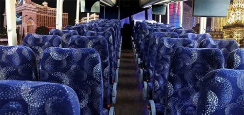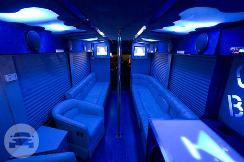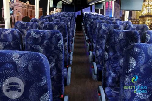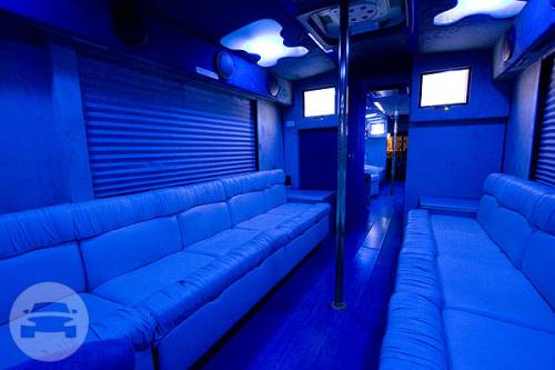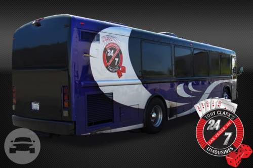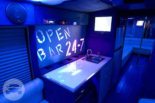Up to 34 Passengers Custom Leather Interior Diamond Plate and Hardwood Flooring 4 Flat Screen TV's CD & DVD Player with Ipod Hookup Wet Bar & Passenger Controls The one and only Rockstar Tour Bus! This is a huge Las Vegas Limo Tour Bus with brass dancer poles! Party like a Rockstar in our Limo Tour Bus! Just like our other limousines, Our custom party bus (also known as a party ride, limo bus, limousine bus, party van, or luxury bus) is prefect for any occasion as it provides the most room and is available for any type of Las Vegas party, bus tour or event. One of the largest party buses in Las Vegas sits 35 people and features a custom competition audio sound system, equipped with 8000 watts of heart pounding sound and (6) 15" sub-woofers. In addition this party bus is equipped with 1 authentic stripper pole that has its own Dance floor, a custom ready bar to set up drinks and a private bathroom so the party never has to stop. The party bus adapts to almost any occasion from wedding to Bachelor Parties and also hoover dam tours to California trips, this party bus can basically go anywhere. It's comfortable enough to take long trips and it's fun enough to make it your very own party destination cruising up and down the strip.