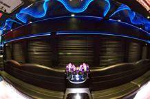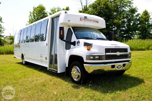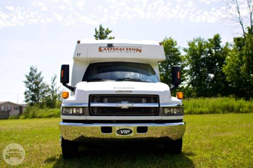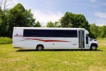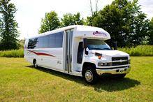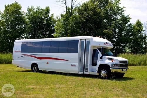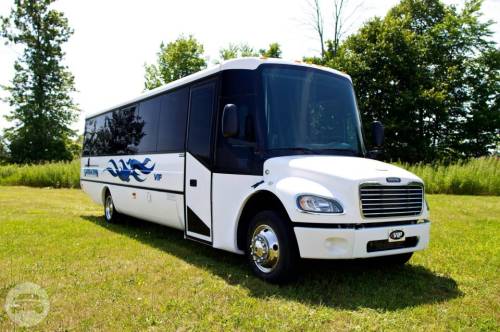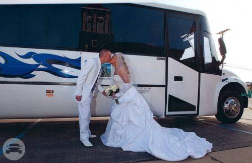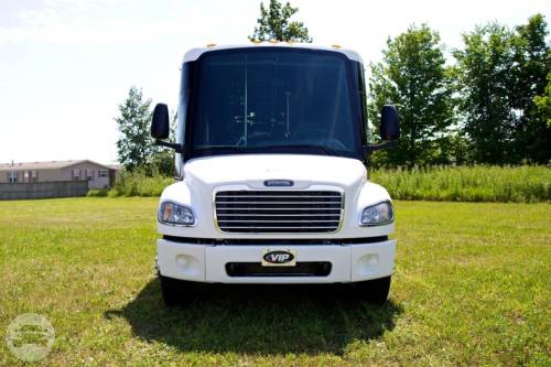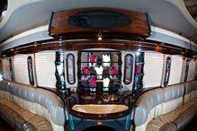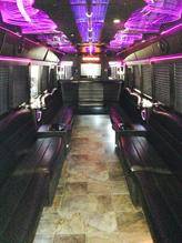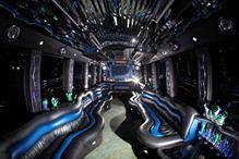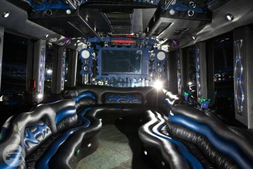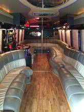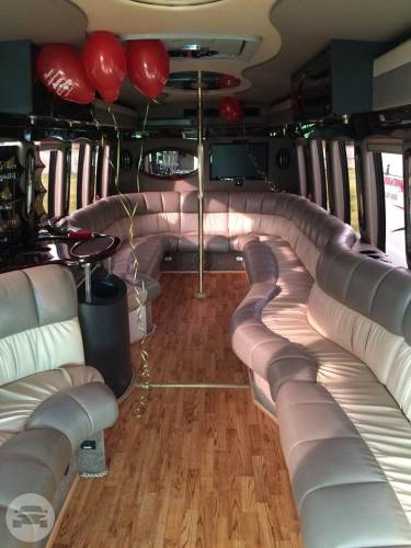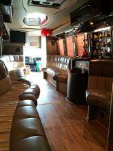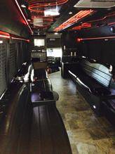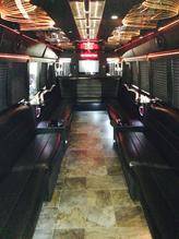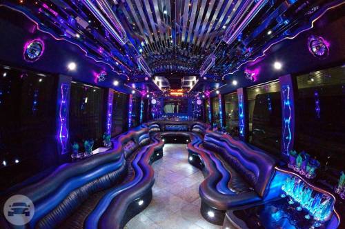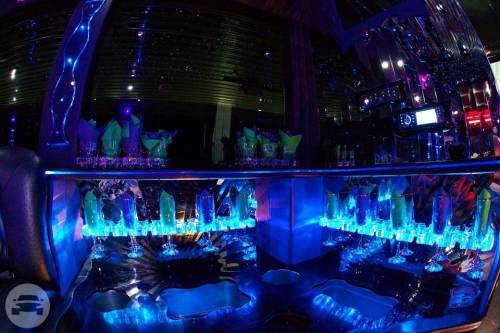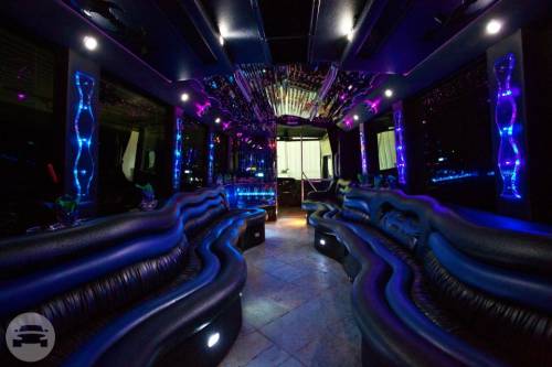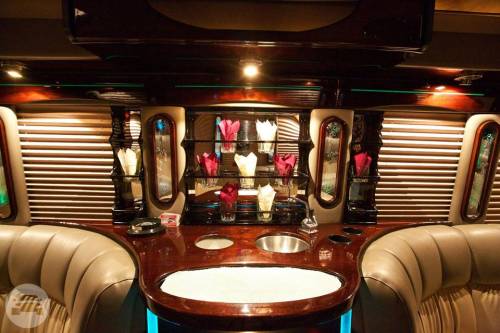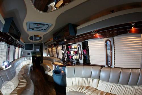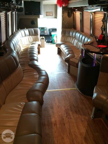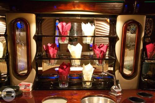 25 Passenger Seating • (2) Flat Screen TVs • Premium Surround Sound System • CD / DVD Player With AM / FM Radio & Aux Port • Fiber Optic, Strobe and Laser Lights • Mirrored Fiber Optic Ceiling • Bar With Built in Ice Chests • Glasses with Decorative Napkins to Match your Occasion • One of a Kind Ceramic Tile Floor