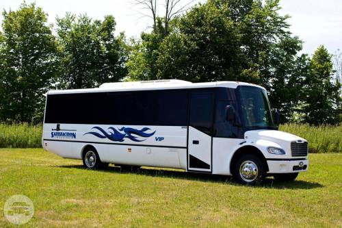 25-30 Passenger Seating (max) • (2) Flat Screen TVs • Premium Surround Sound System • CD / DVD Player With AM / FM Radio & Aux Port • Fiber Optic and Laser Lights • Fiber Optic Lit Ceiling • Ice Chests Built in Throughout • Glasses with Decorative Napkins to Match your Occasion