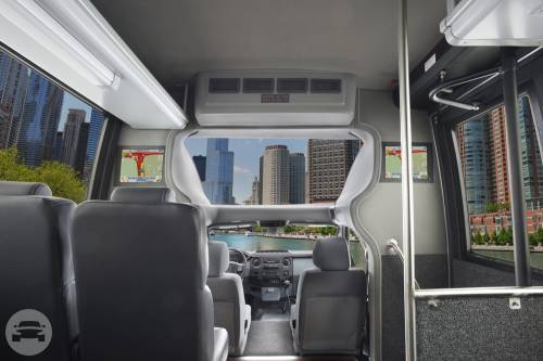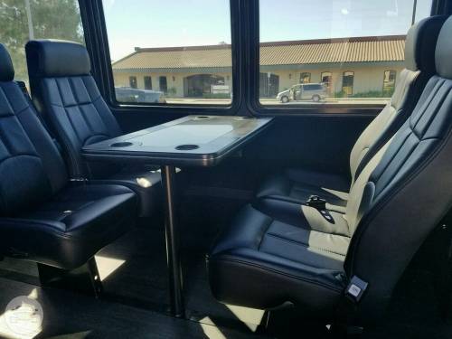 The Ford F-500 executive mini coach is configured with premium leather seating. Each row of seating is equipped with 110V/USB outlets. This vehicle includes two tables with captain chair seating and a large Ice-Chest inside. This vehicle also includes a large sized rear luggage room compartment. With premium audio and a 48” LCD TV screen this vehicle is designed for the perfect luxurious ride. PASSENGER CAPACITY: 26 LUGGAGE CAPACITY: 24