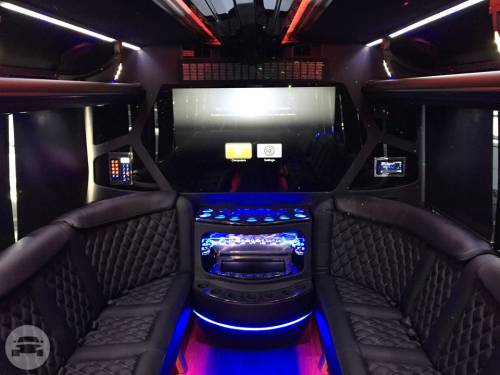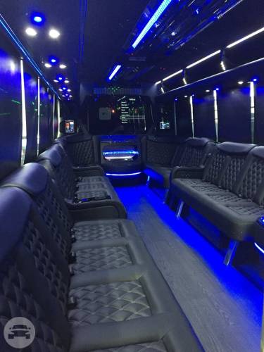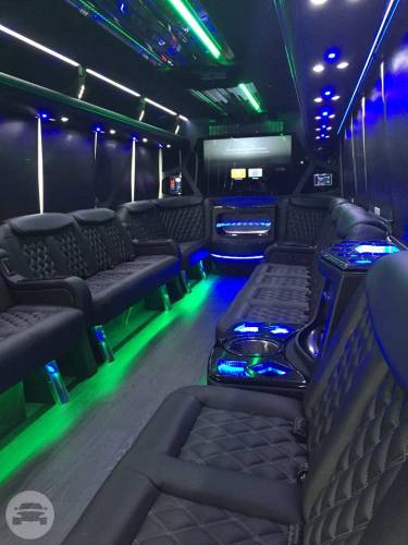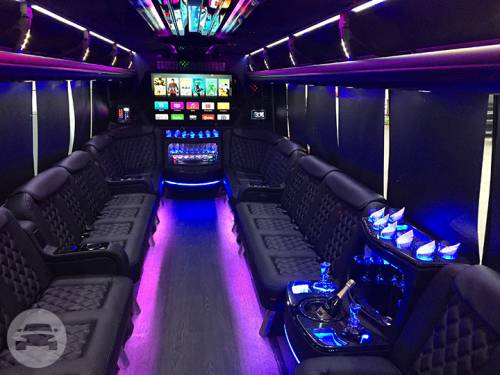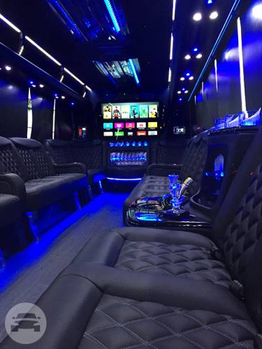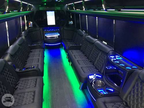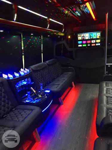 Features // Black Tie's New Limousine Bus is ultra modern and sleek, perfect for any group celebration accommodating up to 23 passengers in luxurious wrap-around seating with wood floors, ample headroom while standing and easy access getting in and out. This limo bus is fully-loaded with the latest technology including 2 large flat screens, AppleTV, AirPlay, Bluetooth/Pandora/iPod connectivity, premium sound system, laser lights and ambient lighting. You'll also enjoy all the amenities and convenience of 2 bars each fully stocked with complimentary liquor, soda, water and ice, armrests with built-in cup holders and USB/power outlets, and overhead storage. Seating // 1-23 passengers