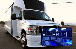 20-28 Passenger Seating Granite Bar 42" Plama TV / DVD 2-Tone Color Leather Interior Disco Ceiling Hardwood Floor Premium Sound System iPod Hookup Laser Show