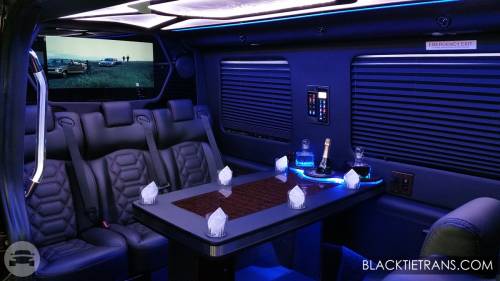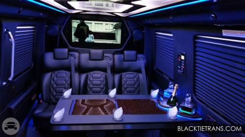 Features // Travel in the lap of luxury in our new Mercedes Executive Limo Vans. These vehicles offer individual leather Captain's Chair seating for up to 6 passengers comfortably; custom designed to create a social atmosphere with a table in the center and 3 facing seats on either side. Drop down steps and a high ceiling roof allow for easy access in and out of the vehicle and head room to stand. Enjoy all the luxuries of the center table with built-in cup holders, wood flooring, power outlets, surround sound, 2 TV monitors and media control panel. Perfect for use as a shuttle, tour vehicle or corporate transport. Enjoy the complimentary liquor, champagne, ice, sodas and water. Seating // 1-6 passengers