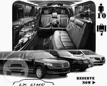 Our 10 passenger limousines offer the ultimate in state of the art luxury with features like two 20″ flat screen television’s with one that is retractable in the divider and the other along side the bar, stereo DVD player with surround sound, FM Stereo/CD audio system, changing multi color fiber optic mirrored ceiling, comfortable J-style seating with leather interior and a beautiful cherry wood bar.