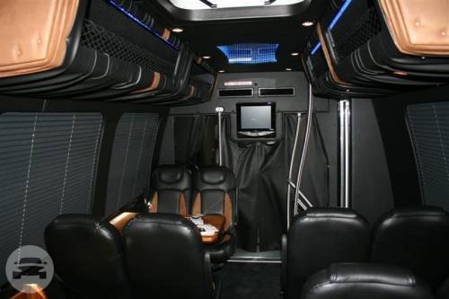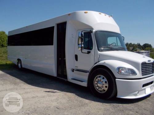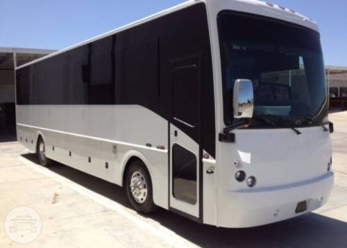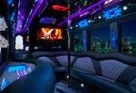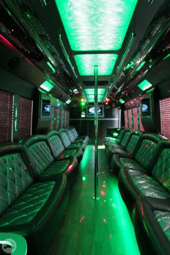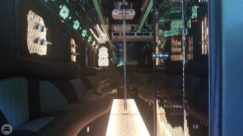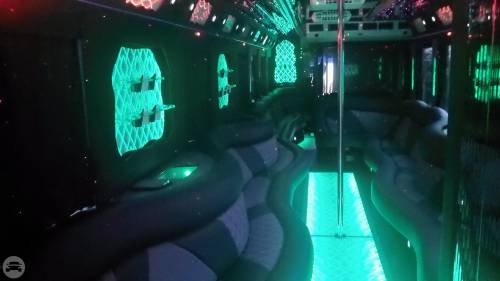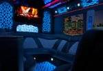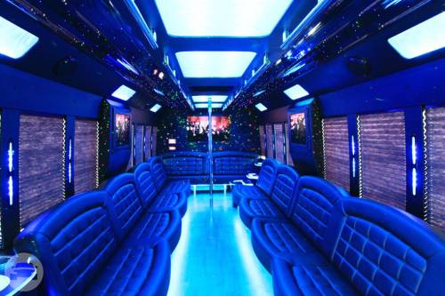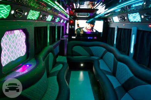 Our 40 Passenger Party Bus is the "JR" to our Mega Bus, this bus provides an unforgettable atmosphere and an unsurpassed ride for as many as 40 passengers. Its exquisite features include: Soft Silver & Black Leather Couch Seating Laser Lighting LED Flash Lighting Fiber Optic Lighting 5 Large Flat Screens DVD Player Custom Stereo Sound System Mp3/ IPod Compatible VIP Section In Rear Restroom