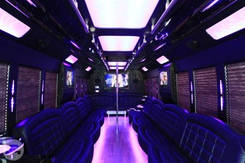 Lynette's 34 Passenger LimoBus is luxurious, comfortable and roomy! It's fully loaded with the following amenities: Color changing LED lighting EVERYWHERE Laser Lighting Luxurious limo seating for up to 34 people 5 Flat Screens CD/DVD/IPOD Stereo