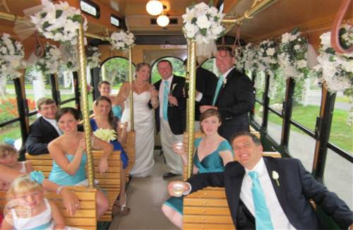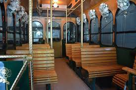 Trolley Features Red Carpet Rolled out at the Ceremony Just Married Sign in Rear of the Trolley Professionally Designed Silk Wedding Floral Décor Complimentary Bottled Water on ice for the Wedding Party Bouquet Holders Inside Trolley for Bride and Bridesmaids’ Flowers Makeup/Hair Mirror for the Ladies as a Final Check before exiting Great Photo Opportunity for Bride and Groom on Conductor’s Platform Air Conditioned/Heated Temperature Controlled Environment for your Comfort Trolley is enclosed to keep out inclement weather