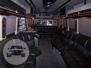 Our 40 Passenger Party Bus is the "JR" to our Mega Bus, this bus provides an unforgettable atmosphere and an unsurpassed ride for as many as 40 passengers. Its exquisite features include: Soft Silver & Black Leather Couch Seating Laser Lighting LED Flash Lighting Fiber Optic Lighting 5 Large Flat Screens DVD Player Custom Stereo Sound System Mp3/ IPod Compatible VIP Section In Rear Restroom
