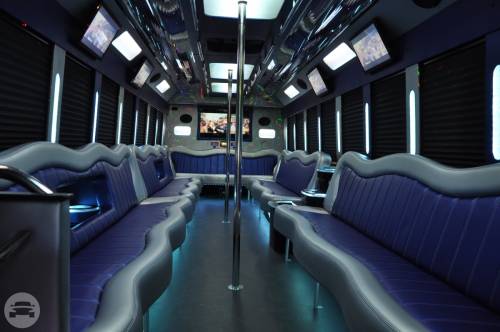 Mega Limousine / Party Bus (Up to 36 Passengers) Our Mega Limousine Bus provides an unforgettable atmosphere and an unsurpassed ride for as many as 36 passengers. Its exquisite features include: Soft Black Leather Couch Seating Laser Lighting Strobe Lighting Multiple Flat Screen TVs DVD Screens Custom Stereo Sound System Mp3/ IPod Compatible VIP Section Available