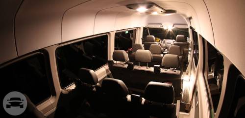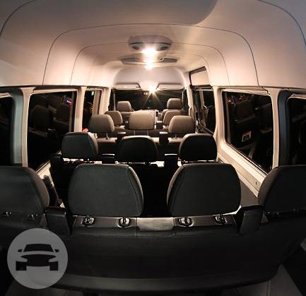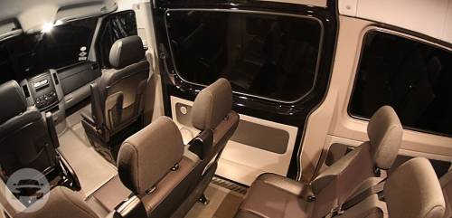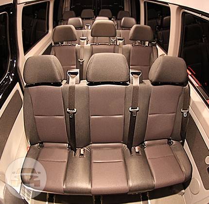 Mercedes Sprinter Passenger Van Features There is a little more room in the Mercedes Sprinter than the Economy Van, so that everyone can ride comfortably plus a few bags or equipment for your occasion. In addition to the cloth bench seating, there are individual shoulder strapped seatbelts. All passengers can enjoy a little class as they ride to the destination. The maximum capacity would be thirteen passengers plus one passenger would be sitting up front next to the driver. This arrangement would be ideal for a service with limited luggage. A group of ten passengers, each with only one large checked luggage and a carry-on. This arrangement would be ideal for a group that require ample room for luggage. Up to seven passengers would be able to carry at least two large checked luggage and a carry-on each. This vehicle can accommodate large boxes and long pieces of equipment.