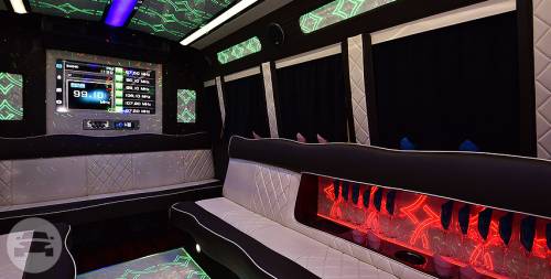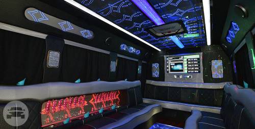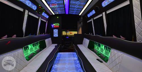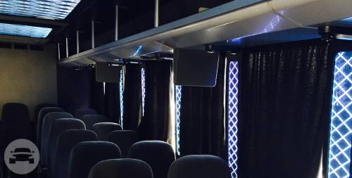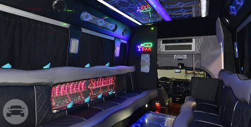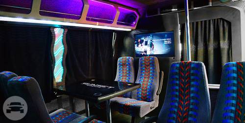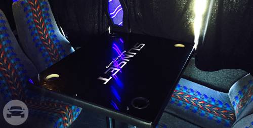 The Only Small Party Bus in Denver Take a ride in Sunset Limos small Party Bus in Denver; designed for smaller parties and events! A miniature mobile club, the small black party bus seats up to 20 passengers and comes standard with fiber optics, lasers, mirrored ceiling panels, CD stereo, iPod and MP3 capabilities, DVD with 42″ and 17″ flat screen and a full beverage bar. Ideal for smaller wedding parties, intimate birthday celebrations, bachelor parties, bachelorette parties or just a night out in Denver. Seats up to 14 passengers. For booking a REAL party bus, Sunset Limos will give you a free t-shirt when you rent a party bus! Sunset Limos does not provide iPod or smart phone cords.