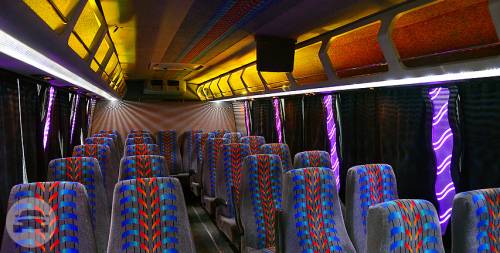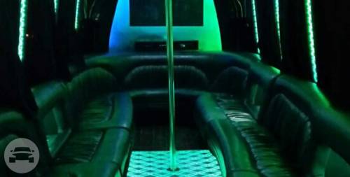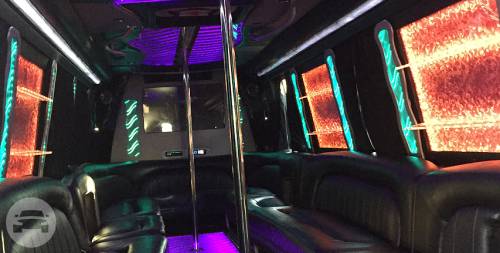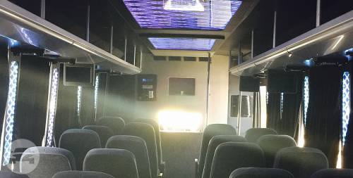 The Chevy 5500 party bus is a night club on wheels, seating up to 34 passengers and coming standard with fiber optics, lasers, mirrored ceiling panels, CD stereo, iPod and MP3 capabilities, DVD with 42″ and 17″ flat screen and a full beverage bar. The Chevy 5500 party bus also comes standard with a stripper pole and disco dance floor on the back of the bus which makes it an ideal vehicle for any bachelor party! Also ideal for birthday celebrations, bachelorette parties, weddings or just a wild night out in Denver. Seats up to 34 passengers. 30 passengers for the most comfortable seating. For booking a REAL party bus, Sunset Limos will give you a free t-shirt when you rent a party bus! Sunset Limos does not provide iPod or smart phone cords.