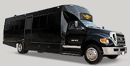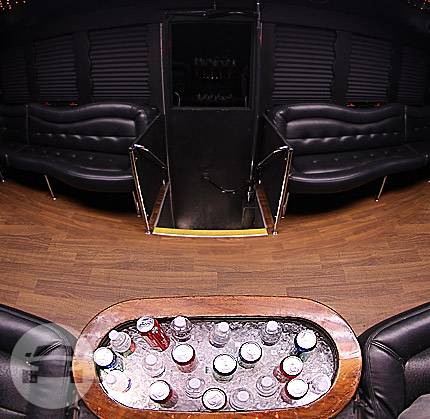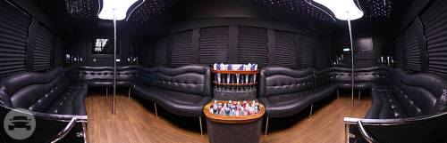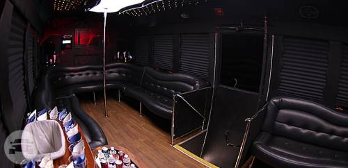 Our 32 passenger party bus is equipped with black leather sofas that wrap around the inside walls of the bus, TVs, and neon lighting to party on the move! This party bus is a perfect for an all-out night with it luxurious interior and topnotch party atmosphere. This is our best quality party bus that customer’s fall in love with. Known for its lights, sound system, extra space on the dance floor and TWO dance poles for those who really are in the mood to party! Black 32 Passenger Party Bus Features This 32-seater comes with a 2 flat-screen TVs, DVD player, iPod connections and updated sound system. Any one wants to dance the night (or day) away? The soft black leather seating wraps around the interior of the bus, the wooden dance floor is the centered and topped off with 2 dance poles that is properly anchored to the vehicle! Extra tall bottle chillers, ever changing neon lights and star lights and mirrors add to the lounge club effect of the party bus.