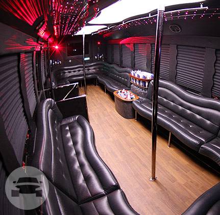 White 30 Passenger Party Bus Features This pristine white 30-seater party bus comes with a flat-screen TV, CD/DVD player, iPod connections, a mirrored ceiling and a dance floor for those who want to bust a move. This white party bus is also equipped with black leather sofas wrapped around the interior of the bus, the wooden dance floor is the centered and topped off with a dance pole that is properly anchored to the vehicle!