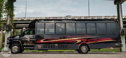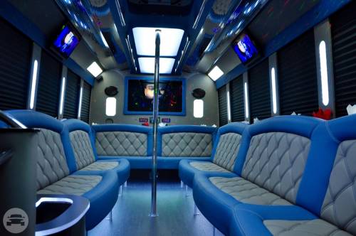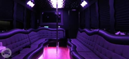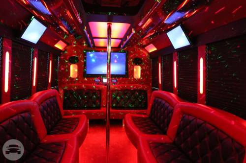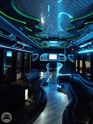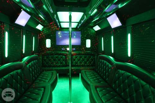 18-28 Passenger Limousine Bus – Party Buses Houston Limo Coach Party Buses provide an unforgettable atmosphere and an unsurpassed ride for as many as 18-28 passengers. Our models’ exquisite features include: Soft, Black Leather Couch Seating Mirrored Stargazer Ceiling Opera Lighting Laser Lighting Strobe Lighting DVD Screens Custom Stereo Sound System Wood Floors IPod / Mp3 Compatible