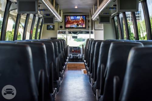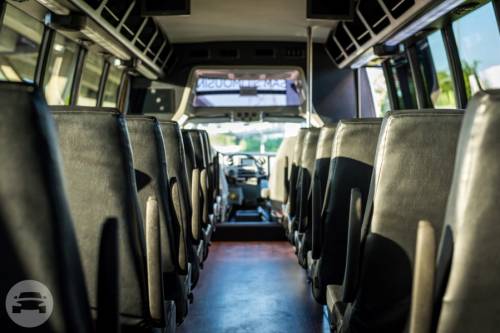 This gleaming shuttle bus has 32 seats and is perfect for student or church trips, taking a large group to a concert or shuttling guests to for a wedding. We can make getting your out of town guests to and from the hotel, to the wedding venue, to reception and back after the reception. Our hourly service offers a surprisingly feasible option for this shuttle option. We also offer pick up and drop off options for this vehicle. To accommodate a smaller group with numerous luggage, these busses come with removable seats to make room for the extra luggage. 32 Passenger Shuttle Bus Features This bus would be able to accommodate a combination of passengers and luggage. With a maximum capacity of 32 passengers, we would be able to accommodate a carry-on per person with some overhead space for light, soft pieces such as handbags, blankets, pillows. With up to 20 passengers, we would be able to accommodate a large checked luggage and a personal bag per person. This bus features, soft cloth seats with individual lap belts, head rests and arm rests. In addition, it comes with an aerodynamic passenger door that greatly reduces outside noise. Each of our buses has an AM/FM radio, televisions and a built-in intercom system which allow for both recreation and communication during your ride.