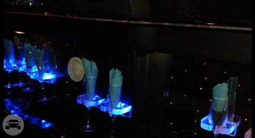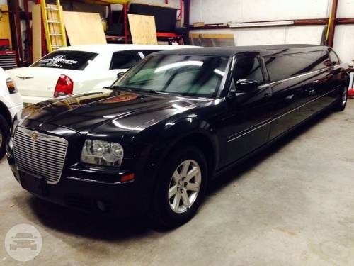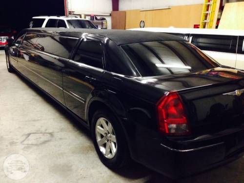 All black Chrysler 300 limousine fits 8-9 adults. Features: This vehicle is equipped with a flat screen monitor, dvd player, cd player, and it is iPod / mp3 player ready. This limousine has 2 large built in coolers, mirrored ceiling, and neon color changing lights.