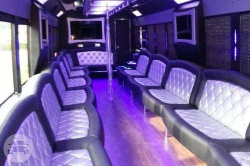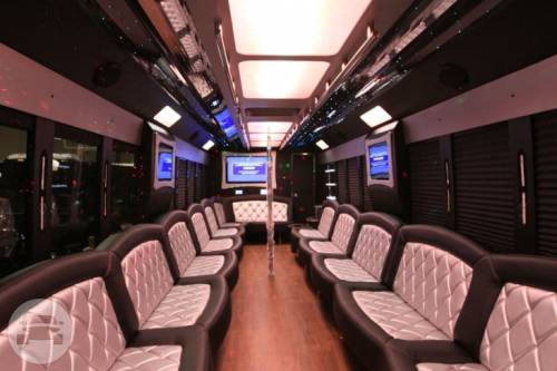 35 passenger Party Bus 2015 White or Black Party Bus / Limo Bus can seat up to 35 people and is perfect for a wedding, tailgate, sporting event, or any transportation need you may have. State of the Art Lighting and Sound Led Smart TVS White Leather Bench Row Seating with Removal Pole