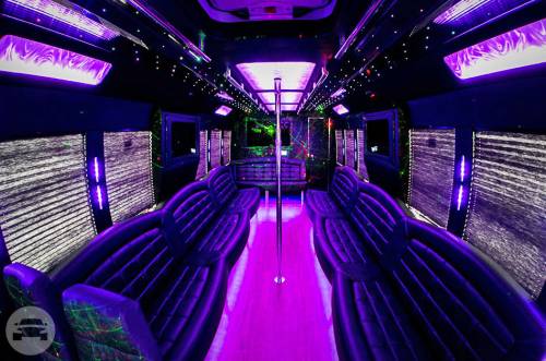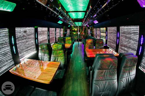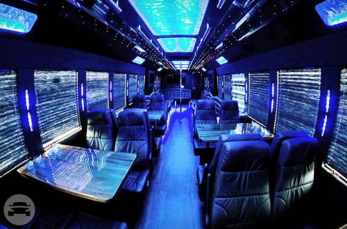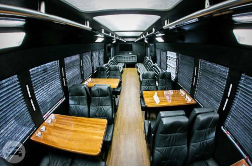 JMI Limousine Services proudly offers our Executive Limo Bus, a method of luxury transportation unlike any other! Whether you’re a business executive trying to make an impression on an important client, or you’re simply providing transportation to a company event, our Executive Limo Bus is sure to impress. This state-of-the-art luxury vehicle can comfortably seat up to 42 passengers and features amenities ideally suited for entertaining business professionals. Amenities include reclining executive chairs, Ostrich textured leather, climate control and restrooms. Each Executive Limo Bus features four executive tables with privacy curtains for if you need to work while riding with us. Our 5 flat screen HDTVs have HDMI inputs so that you can easily conduct presentations if necessary.