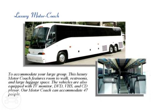 To accommodate your large group. This luxury Motor Coach features room to walk, restrooms, and large luggage space. The vehicles are also equipped with TV monitor, DVD, VHS, and CD player. Our Motor Coaches can accommodate 47 to 56 passengers.