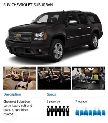 Chevrolet Suburban Large luxury soft and quiet. 5 door black colored, 6 passengers and 7 luggage.