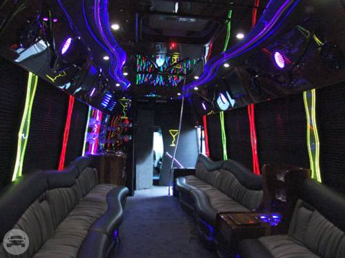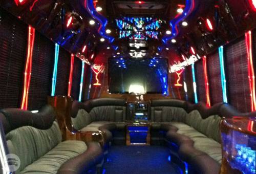 This is the ultimate party vehicle. Tons of space and tons of luxury make this an excellent choice for your special event. 14-26 Passengers Large 40" Flat Screen TV 5 smaller TV's surrounding the cabin 800 Watt Surround Sound Stereo System Onboard restroom iPod/MP3 player plug-in DVD Player Two beverage centers stocked with ice/soda/water Glassware is provided for your use