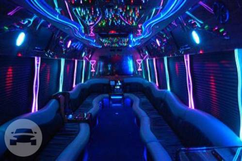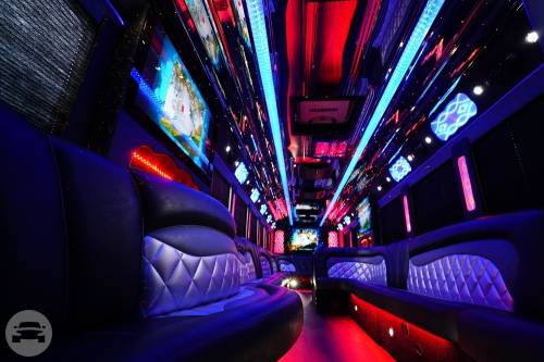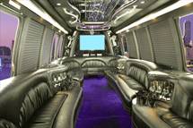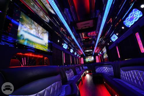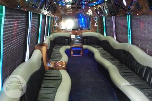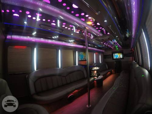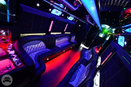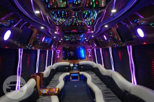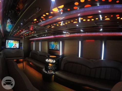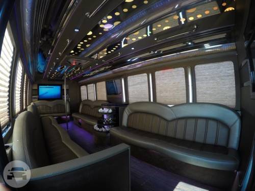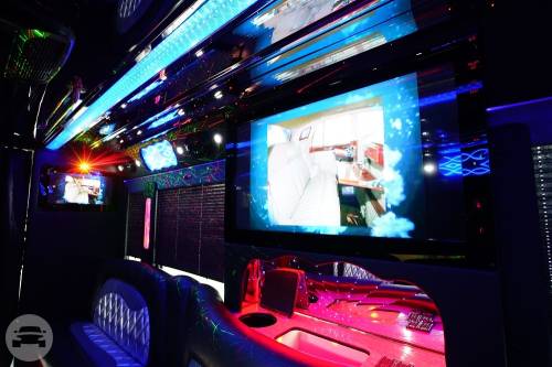 This is the ultimate party vehicle. Tons of space and tons of luxury make this an excellent choice for your special event. 14-26 Passengers Large 40" Flat Screen TV 5 smaller TV's surrounding the cabin 800 Watt Surround Sound Stereo System Onboard restroom iPod/MP3 player plug-in DVD Player Two beverage centers stocked with ice/soda/water Glassware is provided for your use