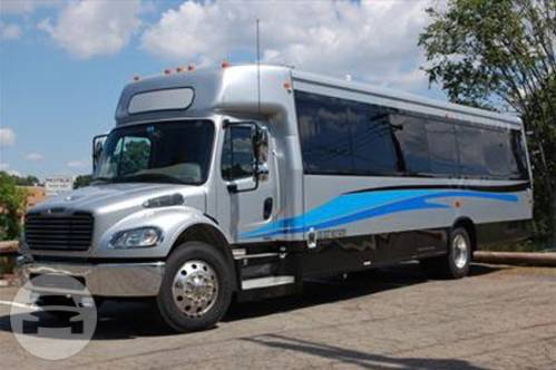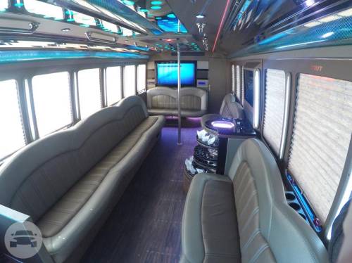 Our 28 Passenger coach party bus is roomy enough to get the party started. Offers lots of features and amenities that make it perfect for bachelor/bachelorette parties, weddings and of course proms! LIMOUSINE DETAILS Party Coach 28 Passengers Gray Interior Gray Exterior