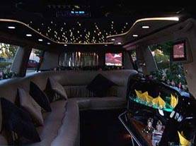 Second evaporator in the rear compartment (Extreme Air Conditioning) Rear heat unit for climate control Additional condenser with additional condenser fan 12 volt power port for client devices Rear accent lighting with overhead controls AM / FM stereo with single CD player DVD player Three seven inch flat screen color monitors with remote control Insulated passenger compartment for temperature and sound Tinted windows in the rear compartment Slim line vinyl top Mirrored ceiling with multicolor fiber optic star lights and neon Mirrored console with multicolor fiber optic star lights Fiber optic drink rack lighting Mirrored divider panel with multicolor fiber optic star lights Double neon rope in console and headliner accent strips Simulated leather seating J-Seat configuration Four LED style coach lights per pillar Side marker lights Fiberglass running boards