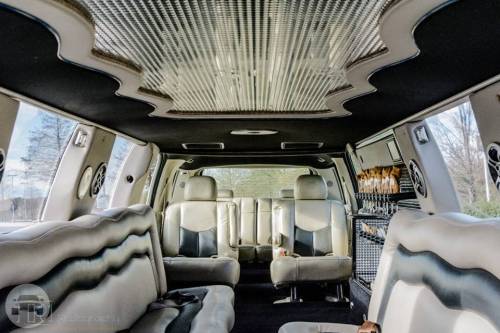 Features: 5th door that increases safety and convenience, luxury plush cream leather interior, lighted glossy bar, mirrored stargazer ceiling with fiber optics and neon light ceiling that changes multiple colors, ice and champagne cooler, full bar service set-up, a flat screen video monitor, DVD, CD player surround sound with surround sound and iPod and MP3 player connectivity, courtesy mirrors, interior lighting, privacy partition, all ready for fun with a sleek limo body style