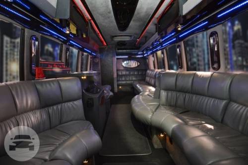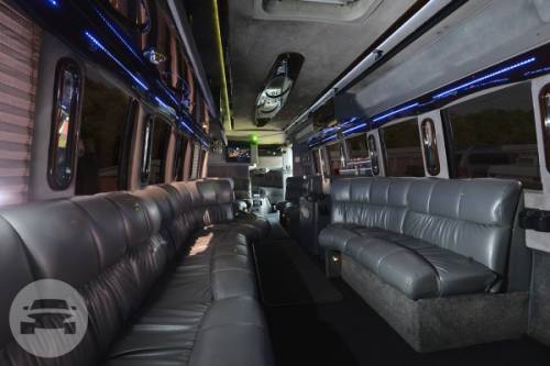 Holds up to 24 Passengers Includes the following amenities: Custom Leather Seats Mood & Fiber Optic Lighting Strobe Lighting Bose Surround Sound Stereo Mini-Bar With Complementary Beverage MP3 Player / iPod / Phone Hookups Solid Glass Dividers Flat Screen TVs