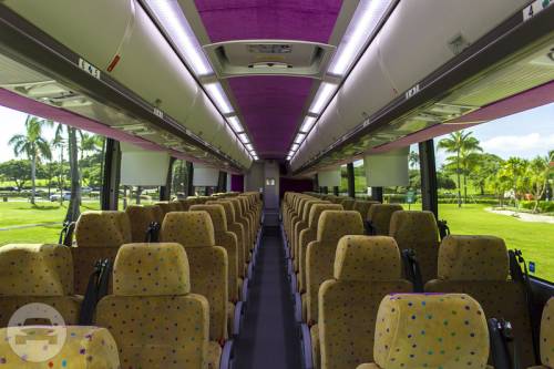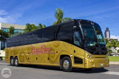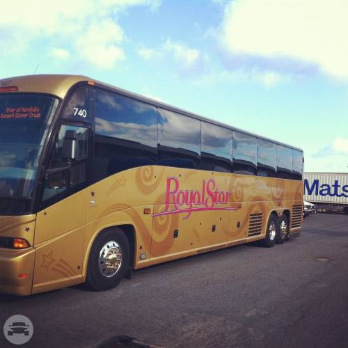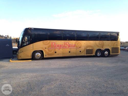 Our signature line of deluxe Gold MCI 4500 Series Motorcoach, ALL less than 5 years old (16 brand new purchased since 2012) are all greener with maximum comfort! 58 seats with onboard restroom. Signature fleet of 20 – greener and maximum comfort! Plus deluxe upgrades, like no other, including: Mint and hand towelette service. Onboard restroom Complimentary digital signage. Highest safety standards with seat belts and professional driver. Easy access with kneeling feature and wide spiral staircase. Adjustable headrest and footrest, reclining chair with designer upholstery and computerized air-conditioning for your comfort. Large and tinted windows for panoramic view. Advanced audio / DVD video system with flat screens. Large baggage bay and ample overhead storage. Michelin tires with custom hub caps. Comes with Royal Star service of professional and friendly Royal Star drivers. Wheelchair = 2