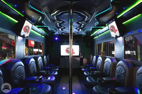 24 passengers Carry-on luggage only Smoke Machine Lounge style seating interior White exterior Illuminated rear controls Fiber-optic lighting 12 Volt power source Fully-uniformed chauffeur Complimentary bottled water
