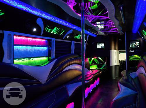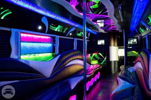 38 Passengers Luggage for 40 Black exterior Lounge style seating interior Illuminated rear Fiber optic lighting DVD PLAYER WITH WIRELESS BLUETOOTH CONNECTION 42'' FLAT SCREEN TV DANCE POLE