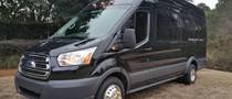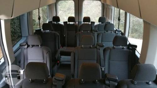 Capacity: 14 Passengers Our late model Ford Transit Vans are available for airport transfers, charters and nights on the town. They seat up to 14 passengers in rows and include a CD player and Luxury Seating.