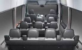 Capacity: 14 Passengers Our late model Ford Transit Vans are available for airport transfers, charters and nights on the town. They seat up to 14 passengers in rows and include a CD player and Luxury Seating.
