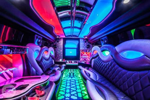 Seats 24 passengers Standing Up Room 3500 Watt System Three Jet-Doors Disco Floor/Ceiling 50" Plasma 32" Plasma Chrome Wheels **************************** ALL weddings come with FREE bottle of champagne! White runner and red carpet available for additional charge. Vehicles come stocked with water and ice. BYOB (Bring your own bottle) on all vehicles, due to New York State law we cannot provide any alcohol. NO ALCOHOL ALLOWED ON PROMS!!