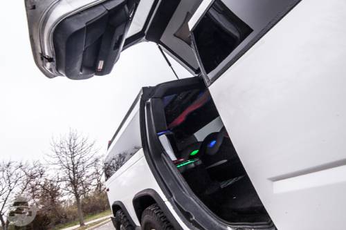 Holds up to: 6 - 14 Passengers Colors: Black exterior with Black interior, White exterior Includes: TV, CD/DVD Player, Moon Roof, Bar, Leather Seats