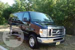 BLACK ECONOLINE VAN: Model: Ford Econoline – Grey Interior, Black Exterior. Bench seating which accomodates 14 passengers without luggage & 10 passengers with luggage. NOTE: The back bench MUST be put in to accomodate 14 passengers! This vehicle does not have a TV. Great for shuttles.