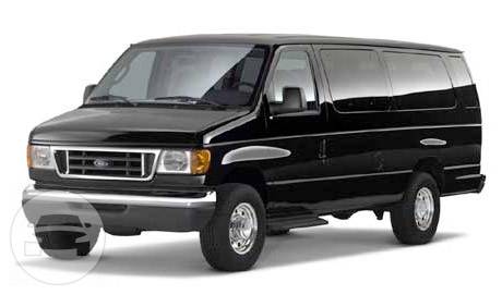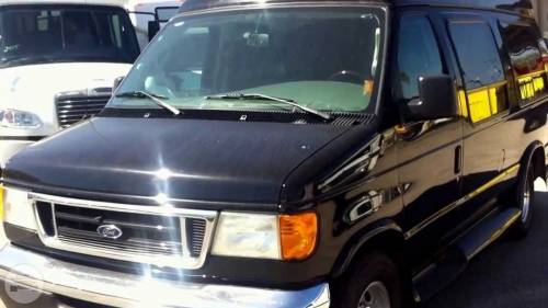BLACK ECONOLINE VAN: Model: Ford Econoline – Grey Interior, Black Exterior. Bench seating which accomodates 14 passengers without luggage & 10 passengers with luggage. NOTE: The back bench MUST be put in to accomodate 14 passengers! This vehicle does not have a TV. Great for shuttles.